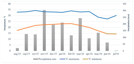 Biweekly values of precipitation (mm) and maximum and minimum air temperatures (°C), collected from August 2015 to July 2016. Selvíria, state of Mato Grosso do Sul, Brazil, 2015/2016. Source: Canal Clima, UNESP Ilha Solteira.