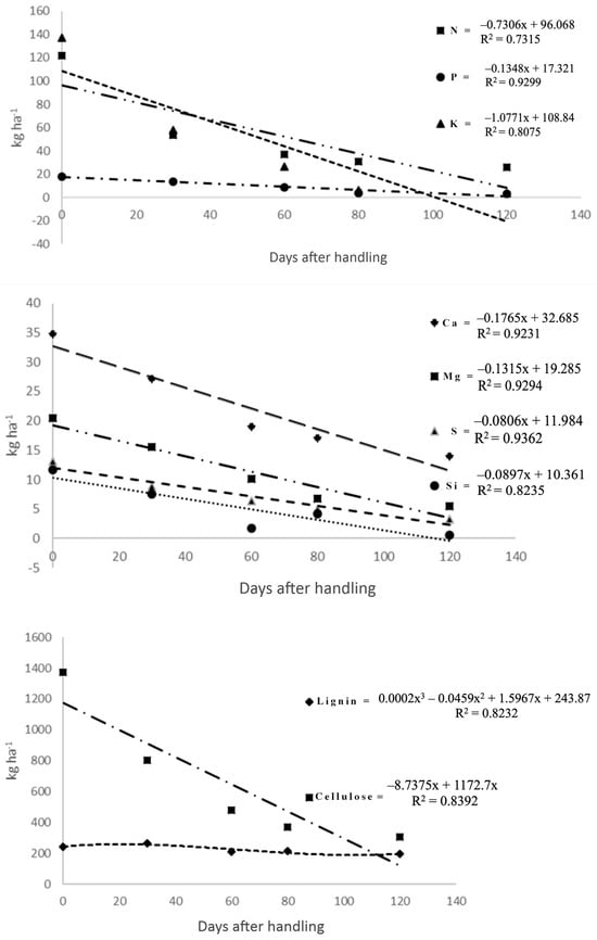 The lignin and cellulose contents in acid detergent were determined following the methodology cited by Van Soest and Wine [22], using the 72% (v/v) sulfuric acid method. These analyses were conducted on plant material at time 0 (management time) and on the remaining material in decomposition bags at 30, 60, 90, and 120 days after residue management. The contents of macronutrients, total Si, lignin, and remaining cellulose were determined by the product of the DM amount (at each decomposition time) and the nutrient contents in the plant residue, presented in kg ha−1.