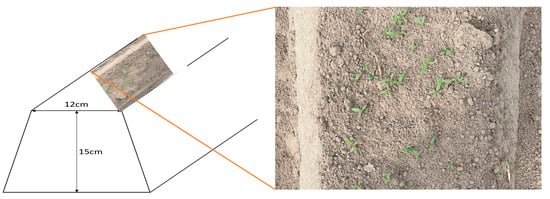 The natural conditions influence the approach to destruction. Carrots are grown in a ridge culture. These ridges run parallel across the field at a distance of 75 cm. The dams have a trapezoidal structure with a height of 15 cm and a top width of 12 cm. The dam structure is shown schematically in Figure 2. The system must only work on a long, 12 cm wide track. The right side shows this working area with the points from above. The dimensions given are approximate values; the actual value may deviate from these due to several factors such as erosion due to wind and rain.