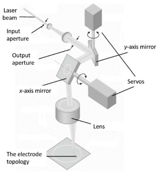 An important part of destroying weeds with a laser is guiding the laser power to the weeds. The laser beam in the system is controlled and deflected using a scan head, which enables the laser to cover a two-dimensional surface area for weed destruction. The scan head utilizes a mirror-based system where two orthogonal mirrors are driven by a galvanometer to continuously move the laser beam across the surface. The operation of the scanner is shown in Figure 5. The scanner used in this study has a beam divergence of 0.1 mrad, achieves a beam diameter of approximately 1.5 mm, and can process an area of approximately 21 cm × 21 cm when positioned 40 cm above the ground, with a positioning speed of up to 2000 mm/s at a height of 1 m.