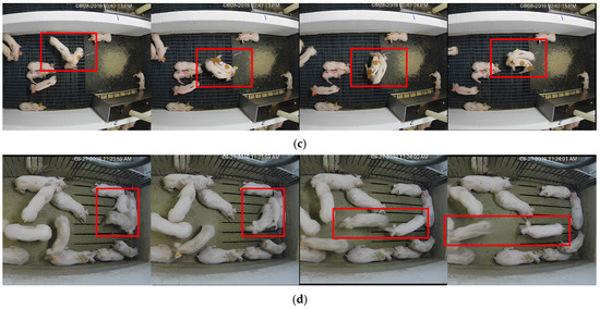 According to the prior studies that have investigated the aggressive behaviors in pigs [16,17,18], there are five main types of behaviors related with aggression: biting (biting any part of another pig’s body), levering (lifting any part of the body with the head), threatening (lunging at another pig), retreating (running away from a pig that delivers aggression), and avoiding (running away from a pig that do not deliver aggression). In this study, only the first four behaviors were considered, and ‘avoiding’ was excluded from the analysis as it was often difficult to tell whether a pig was avoiding another or just running alone. All the episodes were manually labeled by one of the co-authors and two other graduate students independently and the differences between the coders were reconciled through discussions. The final distribution of aggressive behaviors consists of 331 episodes for biting, 127 episodes for levering, 132 episodes for threatening, and 73 episodes for retreating. These four aggressive behaviors were then collectively labeled as aggression and some sample frame captures of four types of aggression are illustrated in Figure 1.