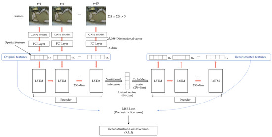 Variational LSTM autoencoder [28,29] was used as a recurrent autoencoder to learn temporal information in the consecutive spatial features. Instead of the multi-layer perceptron (MLP), the variational network was implemented to generate the latent vector, which prevents the model from memorizing the relationship between the latent vector and the reconstructed spatial features.