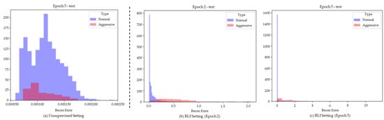 Figure 4. Distribution of reconstruction errors in unsupervised and Reconstruction Loss Inversion (RLI) settings. (a) is the distribution of reconstruction errors when the positive labels are not included in the train set. (b,c) are the distribution when the positive labels are included in the train set for RLI.