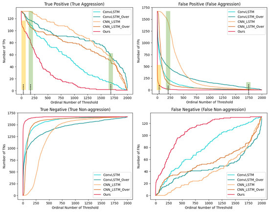 Figure 5. Distribution of True Positives (TPs), False Positives (FPs), True Negatives (TNs), and False Negatives (FNs) by thresholds. In the figure, the label “_Over” following the model name indicates the condition of simple oversampling.