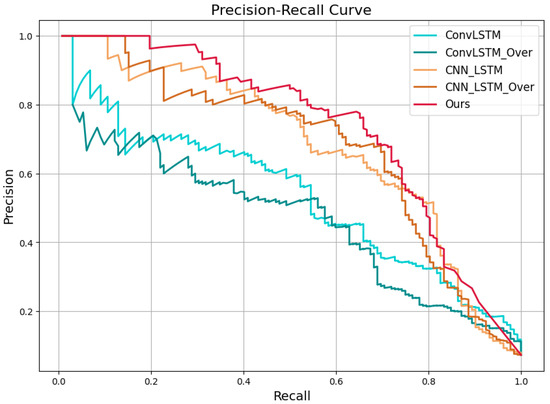 Figure 6. Comparisons of precision–recall curves. In the figure, the label “_Over” following the model name indicates the condition of simple oversampling.