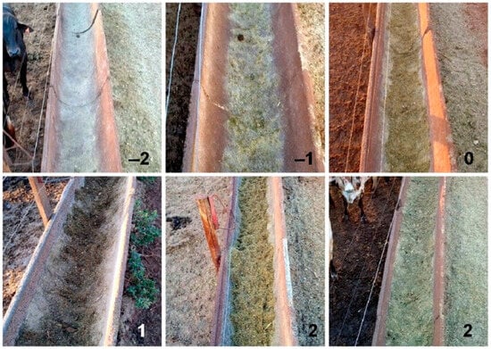Table 2. A score of −2 indicates an amount of leftovers equivalent to 0 kg dry matter (DM)/animal (empty trough), a score of −1 is equivalent to less than 0.3 kg DM/animal (clean trough), a score of 0 is equivalent to 0.3–0.5 kg DM/animal (optimum trough level), a score of 1 is equivalent to 0.5–1 kg DM/animal (some leftover), and a score of 2 is equivalent to more than 1 kg DM/animal (full trough).
