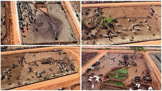 8]. However, there are no reports of studies using RPA images to monitor feedlot environments. Despite advancements in the use of drones in livestock farming, few studies have examined their application for monitoring confinement systems, especially under tropical climates. This innovative study explores the ability of drones to collect data on multiple zootechnical indices in a cattle feedlot system, including feed trough levels, animal counts, and structural conditions. The aim was to evaluate the use of an RPA for collecting zootechnical data in a cattle feedlot system in a tropical climate. This research fills a significant gap by providing a validated, easily implementable, and efficient method for managing large herds, optimizing monitoring, and improving animal welfare.