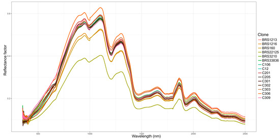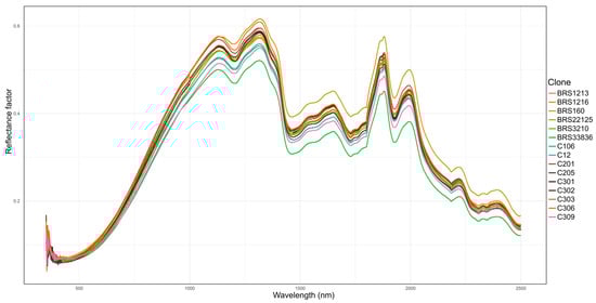 The coffee beans were harvested one year after the seedlings were planted. The fresh beans were taken to the spectroscopy laboratory (Laspec) at the Federal University of Mato Grosso do Sul, Chapadão do Sul campus, for spectral evaluation using a spectroradiometer (FieldSpec 4 HRes, Analytical Spectral Devices, Boulder, CO, USA), which provides spectral information in the 350 to 2500 nm range. The spectral data were used to form the spectral signature of the coffee beans for each clone evaluated (Figure 1). The hyperspectral data were preprocessed using a Savitzky–Golay (SG) smoothing filter and mean normalization, as suggested by [14]. Each coffee sample was subdivided into six samples for spectral analysis.