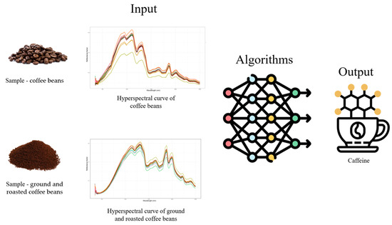 In light of the above, the application of hyperspectral data in machine learning models can contribute to the rapid and accurate determination of the caffeine content in coffee beans. This study aimed to identify the machine learning algorithm with the best performance for predicting caffeine content and to find input data for these models that can improve the accuracy of these algorithms.