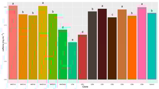 Caffeine plays a significant role in the human food chain through plant-derived foods, such as tea, coffee beans, cocoa beans and nuts. Caffeine is an alkaloid found mainly in coffee and is used abundantly as an additive in foods, beverages and medicines [19]. Differences in caffeine content are common among coffee samples of different varieties, seasons and roasting or grinding processes [20]. Coffea arabica is the most cultivated and consumed species, specifically in Brazil, well known for its fine and exquisite aromas, while Coffea canephora has specific characteristics, such as a higher caffeine content and distinct flavors [3,21,22]. This result is demonstrated in Figure 3, which shows a variation in caffeine content among the clones studied, due to the factors mentioned above.