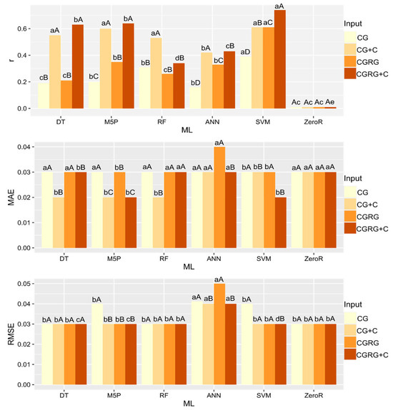 In terms of RMSE, all the inputs tested had the same error rate for DT, RF and ZeroR. M5P and SVM showed a lower error rate when using CG+C, CGRG and CGRG+C. ANN showed the lowest error rate with CG, CG+C and CGRG+C. Evaluating the error performance that each input generated for the models, the use of all inputs was lower for all models except ANN.