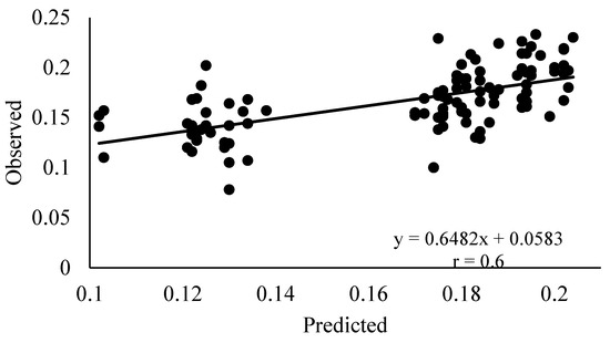 The algorithm with the best performance was SVM using CGRG+C as input, so a regression graph was constructed to express predicted and observed data using the algorithm and input with the best performance (Figure 6). The model’s prediction accuracy was 0.6 for the correlation coefficient and 0.02 for the mean absolute error and root mean square error.