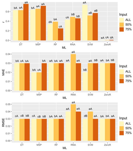 Bar graphs for comparing the means of the precision measures correlation coefficient (r), mean absolute error (MAE) and root mean square error (RMSE) for the prediction of caffeine content in coffee beans in different numbers of samples. Equal uppercase letters do not differ among the inputs tested; equal lowercase letters do not differ among the machine learning models. Mean comparisons were made using the Scott-Knot grouping at 5% probability.