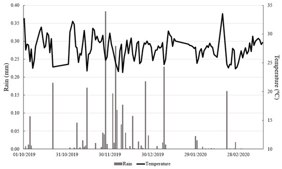 A field experiment was conducted in the 2019/20 harvest with 103 F2 soybean populations in the experimental area of the Federal University of Mato Grosso do Sul, in Chapadão do Sul—MS (coordinates: 18°41′33″ S, 52°40′45″ W) at an altitude of 810 m. The soil of the site is a clayey Red Latosol. The chemical properties of the soil in the 0–0.20 m profile are detailed in Table 1 [14]. According to the Köppen classification, the climate of the region is characterized as Tropical Savanna (Aw). The climatic conditions during the experiment are illustrated in Figure 1.
