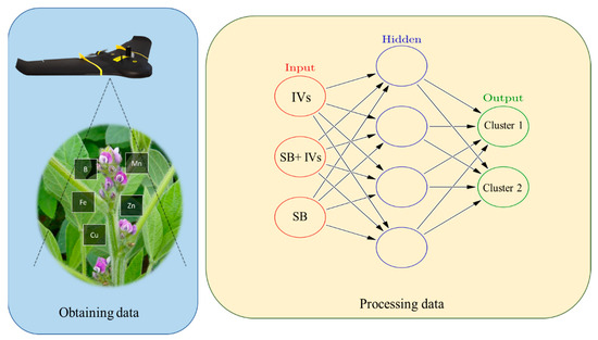 Soybean nutritional determination analyses are accurate, despite requiring reagents and equipment for the process, in addition to the fact that, in the laboratory approach, there is a need to destroy samples, and that the process of obtaining information is time-consuming [4,5]. High-throughput phenotyping (HTP) allows for the provision of detailed information about the crop throughout the cycle in a quick, efficient manner that is non-destructive of the plants’ leaves [6,7].