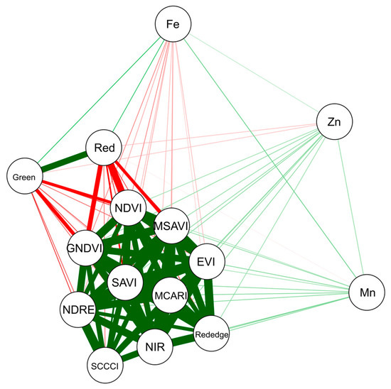 The relationships between spectral variables and micronutrients can be seen by the Pearson correlation network (Figure 3). Red lines indicate negative correlations, green lines indicate positive correlations and the thickness of the line indicates the magnitude of the correlation, becoming thicker when the correlation is above 0.6. The purpose of the figure is to demonstrate that conventional statistical analyses such as Pearson’s correlation do not allow for the establishment of a linear relationship between micronutrient levels and spectral information. There was a high correlation, both positive and negative, between the spectral bands (SBs) and the vegetation indices (VIs) studied, which is expected behavior, since the bands capture data in spectral ranges that partially overlap, and these same data are used to calculate the vegetation indices. Positive correlations can be observed between nutritional variables, with higher magnitudes between Cu and Fe and lower magnitudes between the other micronutrients. Low magnitude or nonexistent correlations are observed between micronutrients and spectral variables, demonstrating the complexity of the relationship between these data.