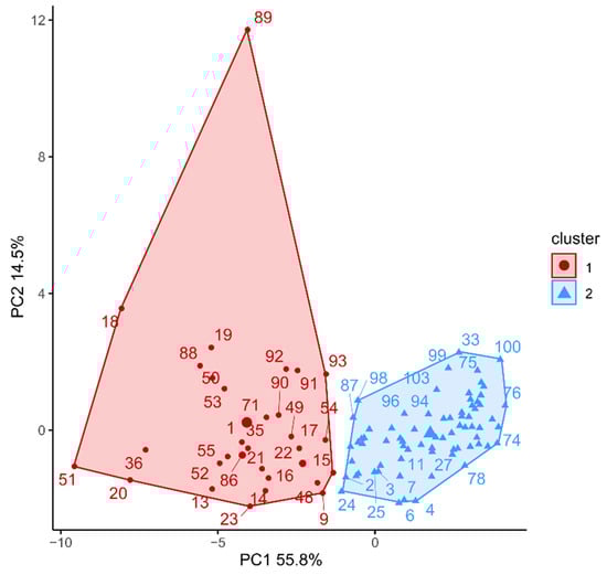 Principal component (PC) analysis combined with the K-means algorithm allowed us to distinguish soybean genotypes into two groups, cluster 1 and cluster 2 (Figure 4). Clusters were grouped according to the micronutrient content exhibited by the genotypes, showing similarity between the genotypes belonging to the same cluster and distinctions by comparing to the other cluster.