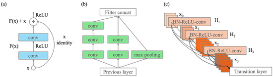 In this study, we used CNN-based architectures—ResNet-50, Inception-v3, and DenseNet-121—for deep learning on RGB image datasets of Z. jujuba Mill., Z. mauritiana Lam., and H. dulcis Thunb. ResNet, Inception, and DenseNet were utilized in this study. ResNet, proposed by He et al. (2016) [26], introduced the concept of residual learning to address issues of slowed learning rates and performance degradation in deep neural networks. ResNet-50 incorporates residual blocks, as shown in Figure 3a, which directly connect input information to the output, enabling residual learning. This allows effective training even in deep networks. Inception, proposed by Szegedy et al. (2016) [27], operates by processing various sizes of convolution operations in parallel within a single layer, as illustrated in Figure 3b. This approach effectively extracts features at multiple scales, enabling the network to learn more accurate and comprehensive information. DenseNet, introduced by Huang et al. (2017) [28], features a structure where each layer is directly connected to all previous layers, as depicted in Figure 3c. This design enhances the flow of information and gradients between feature maps, enabling efficient learning and superior feature extraction.