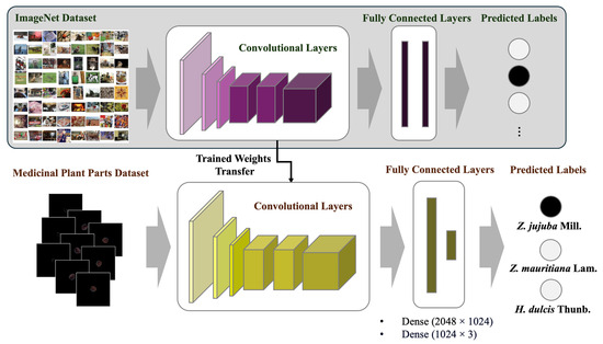 All three models employed transfer learning, as shown in Figure 4. They were pre-trained using the ImageNet dataset, loading the weights and then performing global average pooling at the global average pooling layer to compute the spatial dimensions’ averages, thus producing feature vectors composed of each feature map’s average value. Subsequently, a dense layer with 1024 nodes was added as the fully connected layer, utilizing the ReLU activation function [29] to perform non-linear transformations. For the output layer, a dense layer with three nodes was added to make predictions for three classes, using the Softmax activation function to output the probabilities for each variety.