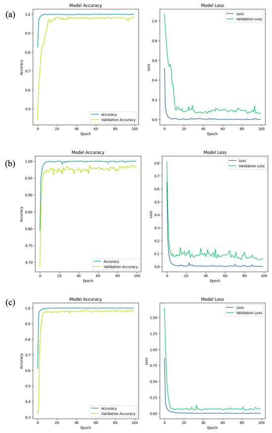 Firstly, Figure 5 illustrates the accuracy and loss values across the epochs during training on the training and validation sets for each model. For the ResNet-50 model, Figure 5a shows changes in accuracy and loss values during training. The training accuracy of this model increased sharply early on, nearing 1. The validation accuracy showed a similar trend, maintaining a slightly lower value than the training accuracy and stabilized after epoch 20. The training loss decreased sharply as the epochs progressed, ultimately converging close to 0. However, the validation loss, while initially decreasing significantly, showed some volatility and remained higher compared to the training loss up to epoch 100.