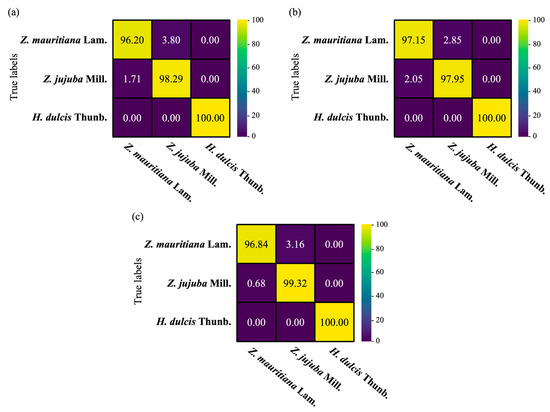 The results of each model’s confusion matrix are shown in Figure 6. In the ResNet-50 confusion matrix (Figure 6a), the Z. mauritiana Lam. class was correctly classified with an accuracy of 96.20%, with 3.80% being misclassified as Z. jujuba Mill. The Z. jujuba Mill. class showed a very high accuracy of 98.29%, with only 1.71% misclassified as Z. mauritiana Lam. The H. dulcis Thunb. class was perfectly classified with 100% accuracy. In the Inception-v3 confusion matrix (Figure 6b), the Z. mauritiana Lam. class was classified with a higher accuracy of 97.15% compared to ResNet-50, with 2.85% misclassified as Z. jujuba Mill. The Z. jujuba Mill. class had a slightly lower accuracy of 97.95% but was still high, with 2.05% misclassified as Z. mauritiana Lam. The H. dulcis Thunb. class was also perfectly classified at 100% accuracy in this model. In the DenseNet-121 confusion matrix (Figure 6c), the Z. mauritiana Lam. class was classified with an accuracy of 96.84%, with 3.16% misclassified as Z. jujuba Mill. The Z. jujuba Mill. class had the highest accuracy among the three models at 99.32%, with only 0.68% misclassified as Z. mauritiana Lam. The H. dulcis Thunb. class was also perfectly classified at 100% accuracy. Thus, all three models perfectly classified the H. dulcis Thunb. class, with DenseNet-121 performing best for the Z. jujuba Mill. class, and Inception-v3 showing the best performance for Z. mauritiana Lam.