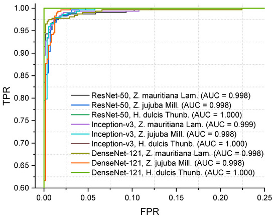 Additionally, the results for each model’s ROC curve and AUC values for the test set are presented in Figure 7. All three models achieved very high AUC values exceeding 0.998 for all species. For H. dulcis Thunb., all three models achieved an AUC value of 1.0. For Z. mauritiana Lam. and Z. jujuba Mill., all models achieved AUC values exceeding 0.998, with the Inception-v3 model showing a slightly higher AUC of 0.999 for Z. mauritiana Lam., while all models had an AUC of 0.998 for Z. jujuba Mill.