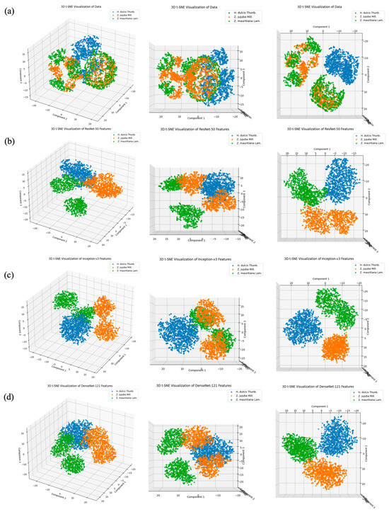 Three-dimensional t-SNE visualization of training data features and features from three models: (a) training data, (b) ResNet-50, (c) Inception-v3, and (d) DenseNet-121. In the plots, the colors represent different species: orange for Ziziphus jujuba Mill., green for Ziziphus mauritiana Lam., and blue for Hovenia dulcis Thunb.