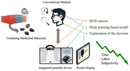 According to the results of this study, the CNN-based model developed here is highly lightweight, fast, and capable of achieving high classification accuracy using only RGB images. Therefore, as illustrated in Figure 9, integrating this model into a compact embedded computing device equipped with a USB-based RGB camera module, a display device, and a box-shaped structure providing a consistent imaging environment with connected LED lights could serve as a portable auxiliary tool for practical use in the medicinal materials market.