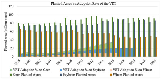 Adoption challenges, such as the high costs of VRT equipment and the need for specialized knowledge to operate and maintain these systems, particularly hinder smallholder farmers from fully utilizing these technologies. Despite these challenges, the adoption of VRT has continued to grow, particularly among larger-scale farming operations. Since 1998, corn planted acres have increased from 80.8 million to 91.5 million acres in 2024. The adoption of VRT in corn fields saw a steady increase, from 5.6 million acres to reaching approximately 35 million acres in 2016. For wheat, planted acres have decreased from 65.8 million in 1998 to 47.2 million in 2024, with VRT adoption growing steadily until 2017, reaching only 8.5 million acres. Soybean planted acres have increased from 72.7 million in 1998 to 86.4 million in 2024, with VRT adoption steadily rising from 4.8 million acres to approximately 21 million acres until 2020 [18,27], as described in Figure 2.