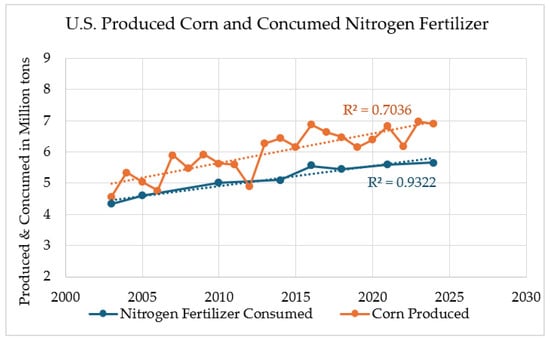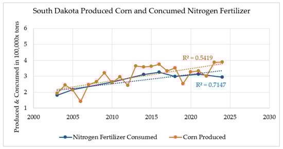 In 2024, the predicted nitrogen fertilizer consumption for U.S. corn fields, based on linear regression interpolation using data from USDA and NASS Surveys in 2003, 2005, 2010, 2014, 2016, 2018, and 2021, is estimated at 5.675 million tons, with 295,000 tons for South Dakota [32]. The projected corn production is 6.896 million tons for the U.S. and 389,000 tons for South Dakota, as described in Figure 3 and Figure 4. Using average 2024 prices of USD 0.171/kg for corn and USD 0.51/kg for nitrogen fertilizer [32], the potential economic benefits of the VRAC, developed at South Dakota State University, Department of Plant Science, Digital Agriculture Lab (SDSU-VRAC), through a 5–15% yield increase and a 5–20% reduction in fertilizer use, are estimated to range from USD 144 million to USD 694 million for the U.S. and USD 7.5 million to USD 36.5 million for South Dakota.
