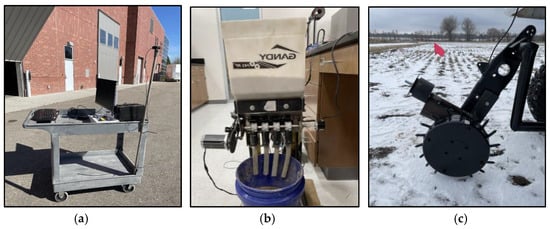 A retrofittable variable rate controller was designed and tested on a four-row Gandy (Owatonna, MN, USA)—Model P454WP12—45-pound feed additive applicator with four outlets, shown in Figure 5a. The Gandy modification consists of modifying four metering seeding wheels, adding a NEMA 23 stepper motor with 3 N.M torque chained with a sprocket with a 1:2 reduction ratio to the main metering shaft, an incremental wheel encoder for seeding discharge feedback Figure 5b, and a ground-driven anti-slip encoder wheel to drive the electric motor, as shown in Figure 5c. Component, specifications, and prices of the Variable Rate Controller are describes in Table 1.