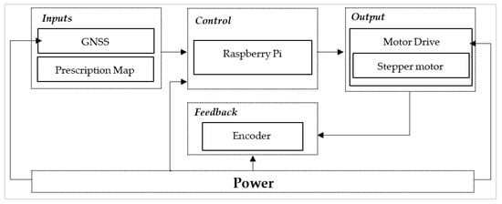 The diagram represents the SDSU-VRAC system design, shown in Figure 6. It comprises the inputs: GNSS for field positioning and a prescription map detailing variable application rates. These inputs are processed by a Raspberry Pi, which controls the system’s actions through a motor drive connected to a stepper motor, executing tasks such as seeding or fertilization as specified. Additionally, an encoder provides real-time feedback on the motor’s performance to the Raspberry Pi, ensuring operations adhere closely to the prescription map.