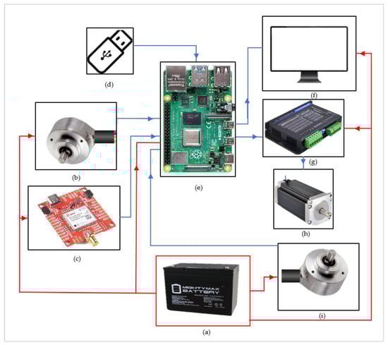 Designed and developed at South Dakota State University—Digital Agricultura lab, the SDSU-VRAC, shown in Figure 7(a–i), requires a common 12 v power supply (a) and consists of an incremental encoder (b), GNSS (c), flash memory (d) as an input, a Raspberry Pi 4 (e) as the processor unit, a monitor (f), a stepper driver (g), and a motor (h) as outputs, with feedback from the incremental encoder (i). A second incremental encoder was used to measure the angular rotation speed and position of the seed metering shaft.