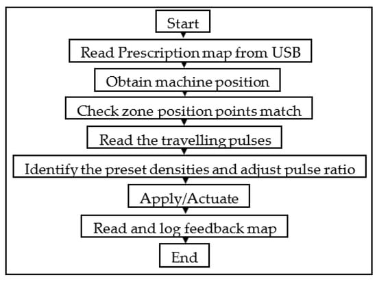 The process initiates with the system reading a prescription map from a USB and obtaining the machine’s position to ensure it matches specific zones. The machine then reads traveling pulses, adjusts the pulse ratio according to preset densities, and actuates to apply the necessary treatment. Lastly, it logs feedback into a map for future reference, described in Figure 8.