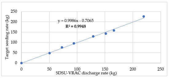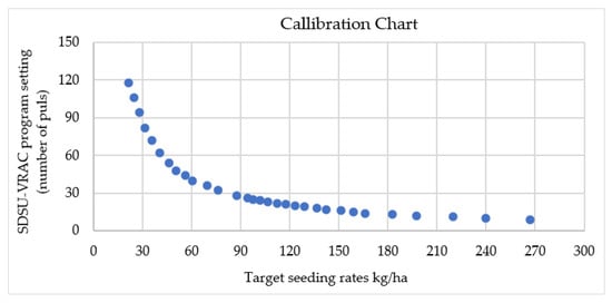 As our prototype metering mechanism (modified Gandy applicator metering mechanism) was not designed for wheat seeding discharge operating with electronic systems, the SDSU-VRAC electronic drive setting was calibrated against our project prototype system to generate a calibration chart for seeding rates (wheat) based on the South Dakota Wheat Commission recommendation [35], created as a reference and calibration purpose, as shown in Figure 9.