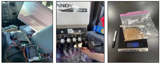 The experiment field was flagged with 56 flags to set each zone boundary. The modified Gandy was placed inside a truck, and the anti-slip wheel encoder was mounted at the back of the truck coupling. While traveling at a fixed speed of 8 km/h, the seed discharged nozzle was placed in a plastic bag, and the bags were replaced on the zone boundaries to separate each zone seeding rate; the bags were then measured separately with a scale inside the lab. Two operators were needed to conduct the evaluation; one was driving the truck, and the other was taking samples, as shown in Figure 12.