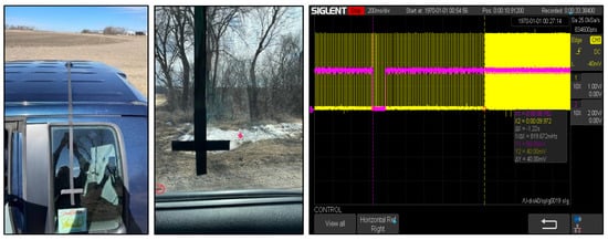The experiment took place at the South Dakota State University research extension on 210th Street West, on a 300 m distance road. The road was divided into 5 zones, and a flag was placed at the boundary of each zone 60 m apart. The experiment was conducted at 6 different speeds and 6 different rates. A strip mark was placed on the truck window aligned with the GNSS attached to the truck roof. An oscilloscope was used to capture the signals sent from the controller to the electric motor to change the rate. The oscilloscope was also connected to a handheld push button used to provide a signal on the boundary of the zone. While the drivers drove the truck, another person took samples by pressing the push button when the flag aligned with the strip, as shown in Figure 13.