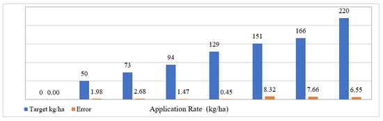 The measured errors compared with the target rates in Figure 16 are 0 kg for the first application rate, 1.98 kg for 50 kg, 2.68 for 73 kg, 1.47 for 94 kg, 0.4 for 129 kg, 8.32 for 151 kg, 7.66 for 166 kg, and 6.55 for 220 kg.