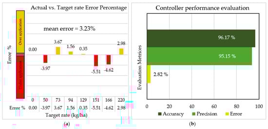 The standard deviation of the average measured samples ranged from 0 to 8.68 kg as detailed in Table 5. The application rate and the corresponding errors of the SDSU-VRAC are depicted in Figure 16. The error values ranged between -5.51% and 3.67%, with an average error of 2.82%, detailed in Figure 17a. The outcomes for the average measured samples demonstrated an accuracy of 96.17% and a precision of 95.15%, as presented in Figure 17b.