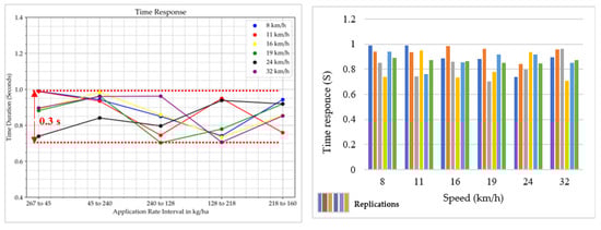 The cluster bar shown in Figure 18 represents the correlation between speed and the time required to change the rate from one zone to another. However, with R square = 0.505, there was a %50.5 correlation between the speed and the time required to change the rate from one zone to another. The human measurement error contributed to the variation in time response variations, where, on average, the measured time required to change the rate was 0.867 s, with variation in the 0.3 s range. In practical applications, the time response determines how quickly the system can react to changes in operating conditions, such as varying speeds during seeding or fertilizing. A lag in time at different speeds can lead to misplaced inputs, such as seeds or fertilizer, which can result in uneven crop distribution, wasted resources, and ultimately, reduced crop yields.