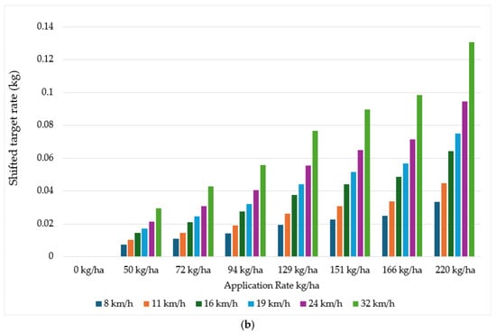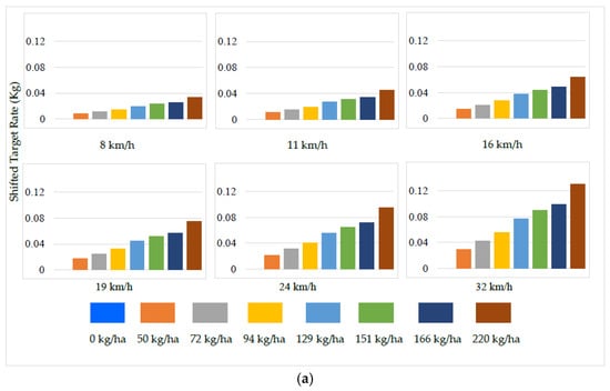 Based on the 63.5 cm applicator width, the shifted target rate (kg) results from the time response delay range from 0 to 0.13 kg; the shifted distances were 2.22, 3.06, 4.44, 5.28, 6.67, and 8.89 m for 8, 11, 16, 19, 24, and 32 km/h speeds, respectively, as detailed in Figure 19a and combined in Figure 19b.