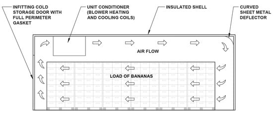 Bananas are subject to various diseases and physiological disorders. Proper temperature and moisture during storage and careful handling slow aging and the development of decay. The process of ripening enables fruits to develop their desired flavor, high quality, taste, color, palatability, and other textural characteristics. Ethylene ripening in a controlled environment helps in getting the right color for the banana [21]. The banana ripening chamber is an important part of the fruit industry, allowing producers to control the ripening process of their bananas and ensuring that their fruits are of the highest quality [22]. The ripening room controls initiation and completion of fruit ripening; Figure 1 shows a typical banana room [23].