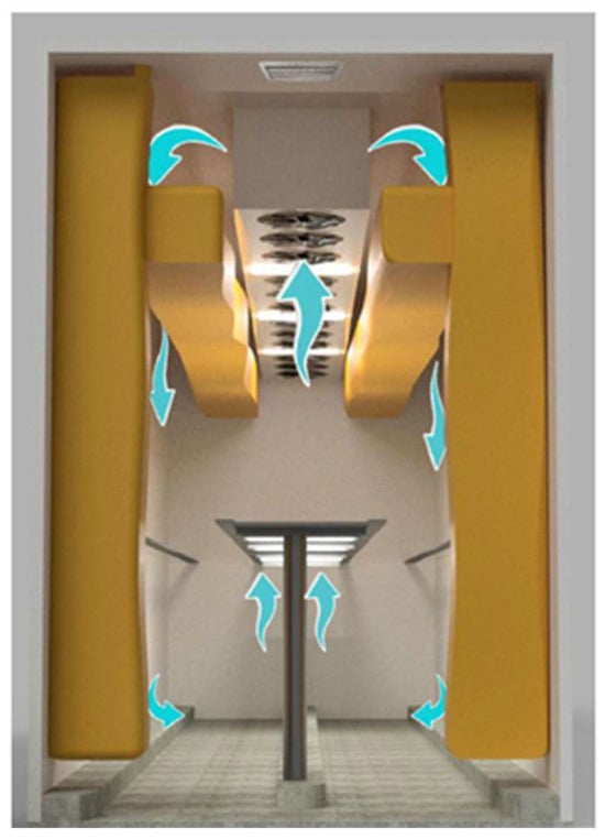 The fresh air ventilation system plays a significant role in banana ripening rooms, ensuring an optimal environment for the ripening of the fruits. A key aspect of the ventilation system is to introduce fresh air in place of extracted air to maintain a predefined concentration of ethylene inside the chamber. It must introduce fresh air at the required temperature and humidity for the room. Air circulation is improved to maintain the temperature with a little variation of only a few degrees. The evaporators are mounted along the middle of the room ceiling (Figure 5). Airflow requirements were calculated based on conditions required at the end of the pulldown period and a high humidity around the fruit near the middle of the room ceiling (Figure 5).