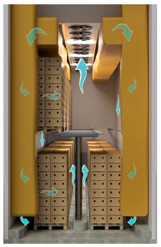To ensure uniform air temperature distribution in the ripening room and improve banana ripening efficiency, a sealing and air-directing system was installed using plastic ducts. These ducts, measuring 0.7 × 0.8 m in cross-section and 15 m in length, were perforated with 0.05 m diameter orifices on their lateral and lower sides. These ducts begin to inflate when the ripening process starts, ensuring a tight seal between the evaporator’s suction area and the air discharge zone. This method guarantees that the entire airflow is directed through all the pallets containing bananas. The duct extends along the length of the ripening room, with its ends sealed near the room’s walls (Figure 6). There are two additional vertical ducts, approximately 0.6 × 0.6 m, that can be moved along the room to direct the airflow in situations where the room is operating at 50%, 75%, or 100% the total capacity. Hellickson and Walker found that the ratio of duct cross-sectional area to effective discharge area decreased by around 25%. The decrease in cross-sectional area was primarily made to achieve a consistent airflow throughout the air distribution duct. The primary reason for reducing the cross-sectional area was to achieve consistent airflow throughout the entire length of the air distribution duct [33,34].