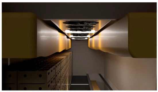 A cooling system with two fans and two fan coil unit motors, positioned in a space connected to the ceiling of the ripening room, regulated the temperature and air flow rate entering the room. Excessive ventilation in the system and elevated moisture levels could pose issues in the ripening chamber. Having the correct air flow balance is essential for the system to operate efficiently. The airflow rate, approximately 48 kW of cooling, was calculated based on the height, depth, and the volume of air flowing through the evaporator coil. The ventilation system in the banana ripening room was created to mimic a typical industrial setup, with an air conditioning unit located at one end of the room. It pulls air in from the bottom and releases conditioned air from the top. The system consisted of a 22 mm aluminum blowing evaporator and a 67 mm suction duct. The half-width evaporator above is mounted to the ceiling near the humidifier and will increase the humidity in the room. After blowing air into the room, the air was thrown at a distance of 6 m from the ground. The suction duct was linked to the area above the ripening room’s ceiling where the fans were situated. The total amount of air brought into the room was 1000 m3/h, meaning the air was changed 3.5 times per hour, in line with standard industrial procedures. Figure 3 shows the forced air circulation through the evaporator inside the empty banana ripening chamber, and Figure 4 shows the same air circulation inside the banana ripening chamber and the way of directing the air flow so as to be as uniform as possible for the ventilation of all the fruits.