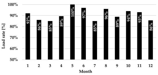 Figure 7 shows the loading rate of the banana ripening rooms for each month of the year 2023. The average load for all six rooms is 91%; in this case study, the value for SEC is equal to 0.06381 kWh/kg per banana for Bucharest.