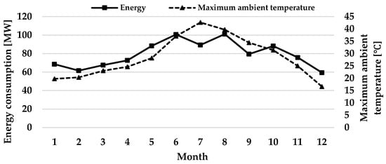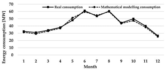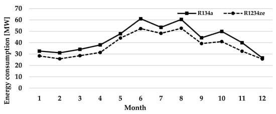Figure 8 shows the actual energy consumption of the compressor operating with the refrigerant R134a for each month, as well as the mathematical modeling of the compressor’s energy consumption using the refrigerant R1234ze(E).