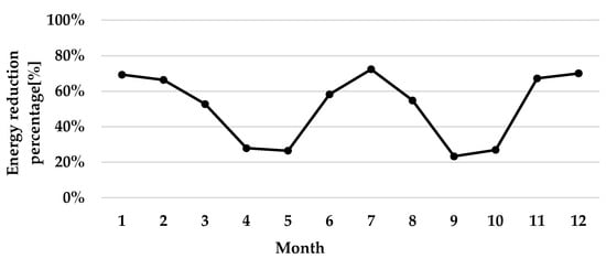 Following the analysis conducted each month using the monthly average temperature, when employing a heat recovery unit, we observe a significant annual energy savings of approximately 41%. In Figure 10, we can see the percentage of energy savings for the ventilation system when introducing fresh air for each month of the year.