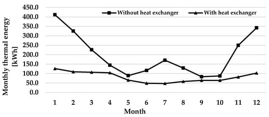 Thermal energy savings increase as the exterior temperature decreases, with reduction percentages rising from 72% in Zone I (at an exterior temperature of −12 °C) to 75% in Zone V (at an exterior temperature of −25 °C). This indicates that the heat recovery system becomes more efficient in colder climatic conditions, contributing to a significant reduction in thermal energy consumption.