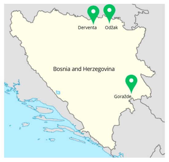 This study covers three locations in Bosnia and Herzegovina: Derventa, Odžak, and Goražde (Figure 1). Data were collected from a total of 15 different fields at each location, carefully selected based on the variability of factors such as weed presence, field size, and wheat density.
